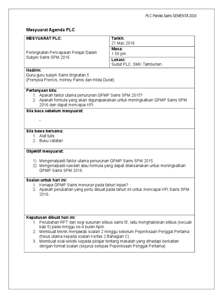 Mesyuarat Agenda Plc Sains Spm 1 Pdf